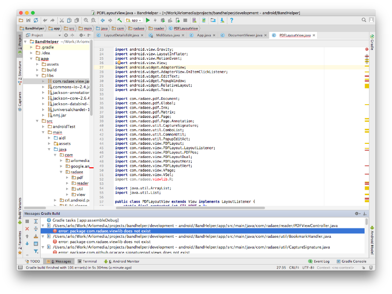 I just added the jar file -- I didn't have that before because I thought it wasn't needed with the source code installed -- but the problem is the same. The build error says "package com.radaee.viewlib doesn't exist." I'm attaching a screen shot.